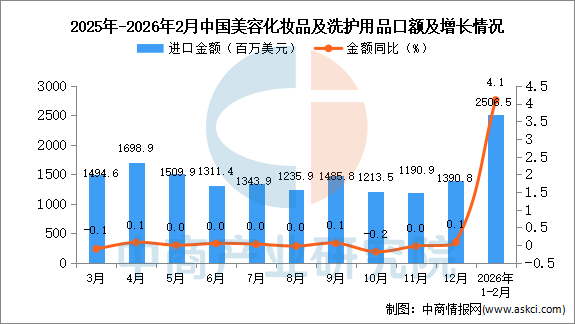 2026年1-2月中国美容化妆品及洗护用品进口量及金额增长情况