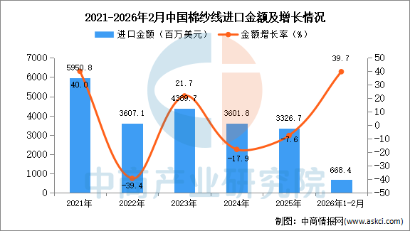 从金额方面来看,数据显示,2026年1-2月中国棉纱线进口金额668.4百万美元,同比增长39.7%。