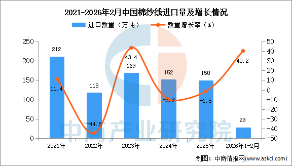 2026年1-2月中国棉纱线进口数据统计分析:进口量29万吨 中商产业研究院 2026-03-25 16:28