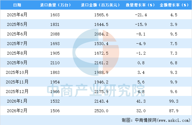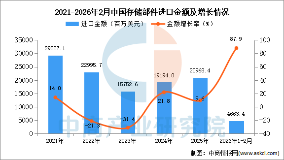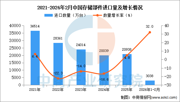 2026年1-2月中国存储部件进口数据统计分析:进口量同比增长32% 中商产业研究院 2026-03-26 08:42