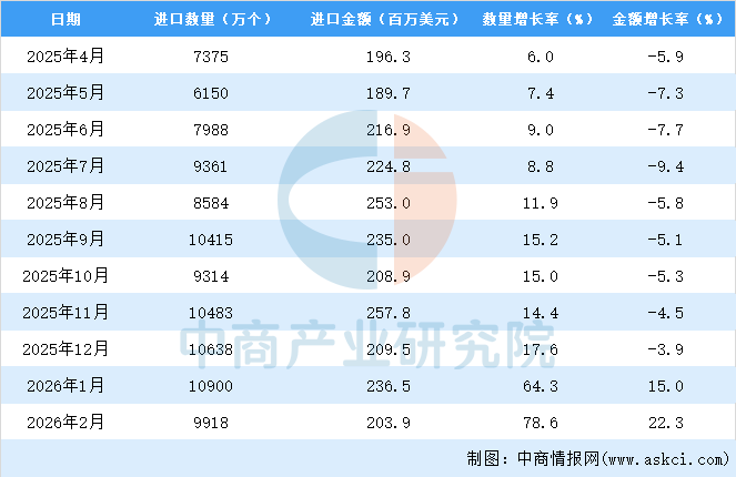 2026年1-2月中国二极管及类似半导体器件进口数据统计分析:进口量同比增长5.2%