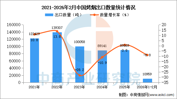 2026年1-2月中国烤烟出口数据统计分析:出口量同比下降8.8% 中商产业研究院 2026-04-02 08:42