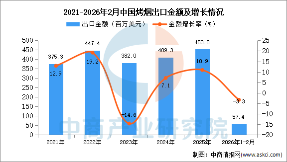 从金额方面来看,数据显示,2026年1-2月中国烤烟出口金额57.4百万美元,同比下降3.3%。