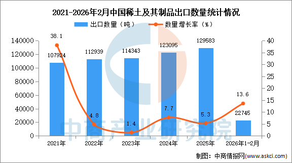 2026年1-2月中国稀土及其制品出口数据统计分析:出口量同比增长13.6% 中商产业研究院 2026-04-07 09:07