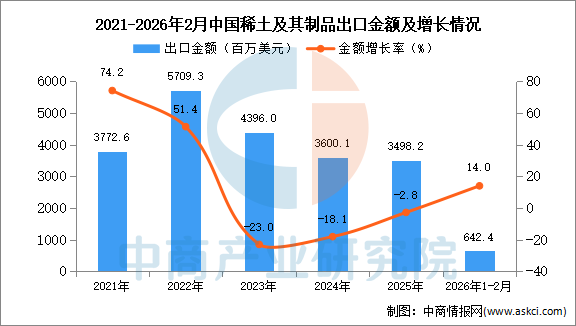 从金额方面来看,数据显示,2026年1-2月中国稀土及其制品出口金额642.4百万美元,同比增长14%。