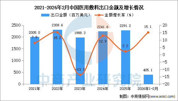 从金额方面来看,数据显示,2026年1-2月中国医用敷料出口金额405.1百万美元,同比增长15.1%。