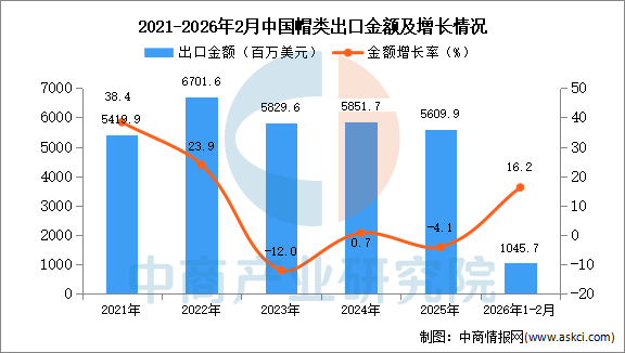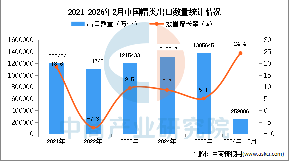 2026年1-2月中国帽类出口数据统计分析:出口量同比增长24.4% 中商产业研究院 2026-04-09 09:00