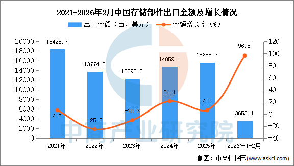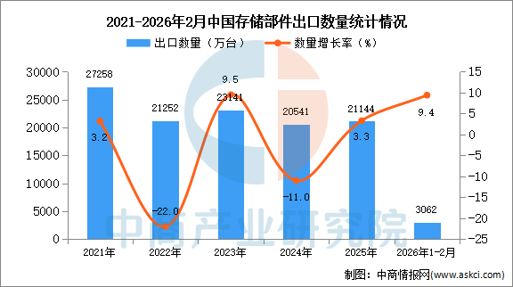 2026年1-2月中国存储部件出口数据统计分析:出口量同比增长9.4% 中商产业研究院 2026-04-11 09:10