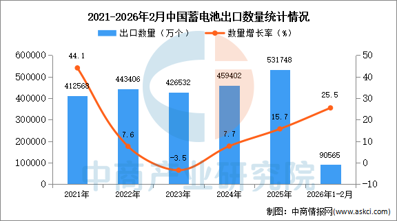 2026年1-2月中国蓄电池出口数据统计分析:出口量同比增长25.5% 中商产业研究院 2026-04-11 09:14