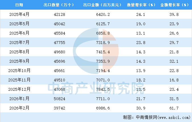 2026年2月中国蓄电池出口量及金额增长情况