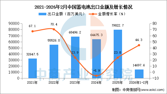 从金额方面来看,数据显示,2026年1-2月中国蓄电池出口金额14697.6百万美元,同比增长44.3%。