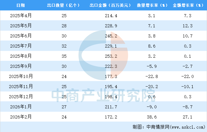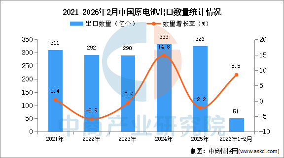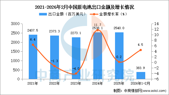 2026年1-2月中国蓄电池出口数据统计分析:出口量同比增长25.5%