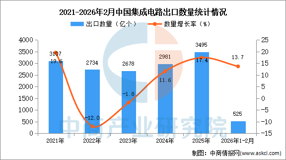中商情报网讯:据中商产业研究院数据库显示,2025年中国集成电路出口量3495亿个,同比增长17.4%。最新数据显示,2026年1-2月中国集成电路出口量525亿个,同比增长13.7%。