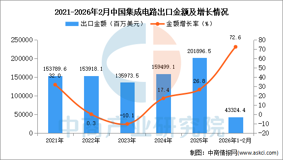 从金额方面来看,数据显示,2026年1-2月中国集成电路出口金额43324.4百万美元,同比增长72.6%。