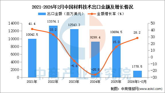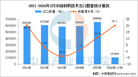2026年1-2月中国材料技术出口数据统计分析:出口量同比增长20.1% 中商产业研究院 2026-04-16 08:40
