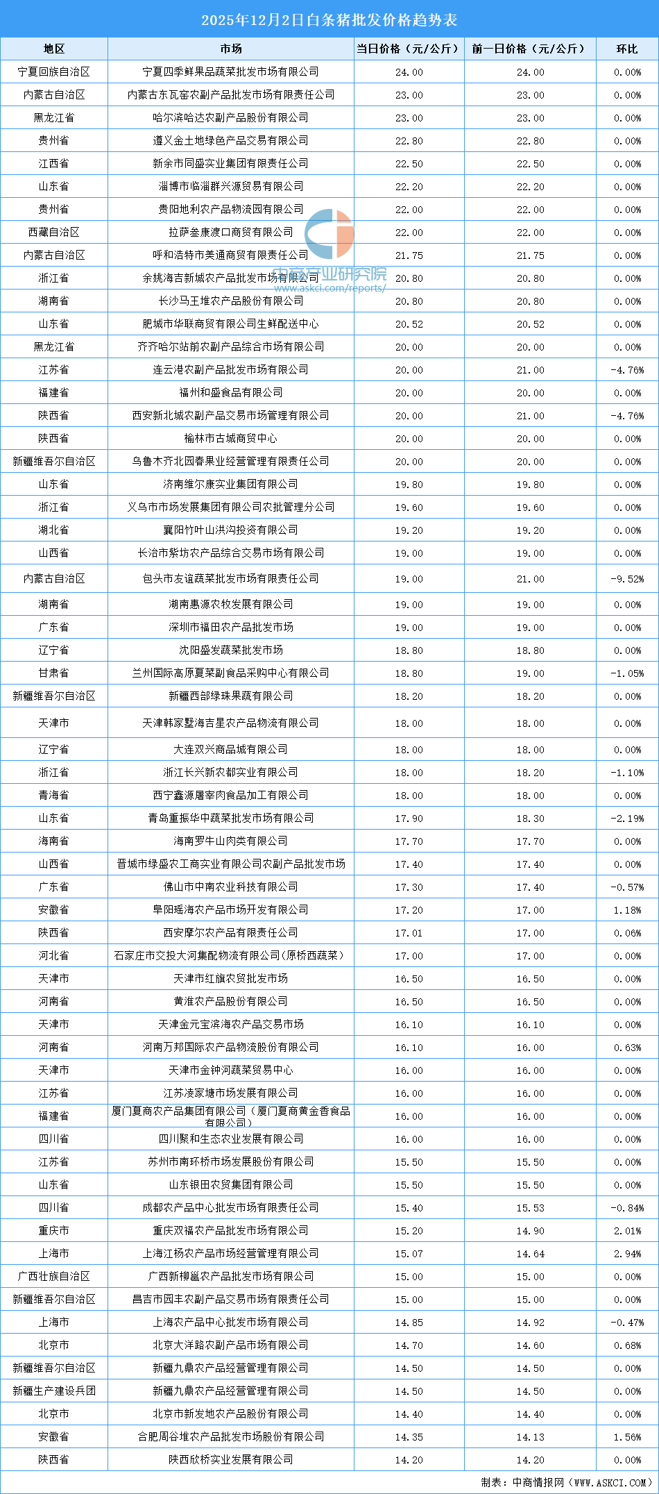2025年12月3日全国各地最新白条猪价格行情走势分析 中商产业研究院 2025-12-03 09:16