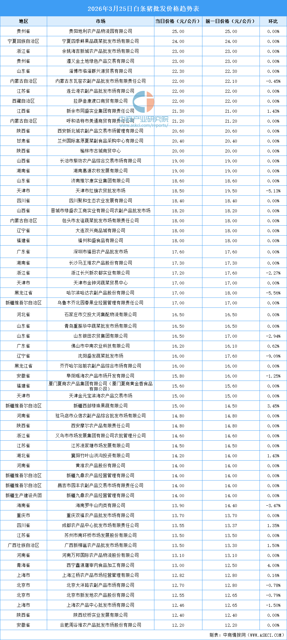 2026年3月26日全国各地最新白条猪价格行情走势分析 中商产业研究院 2026-03-26 11:52